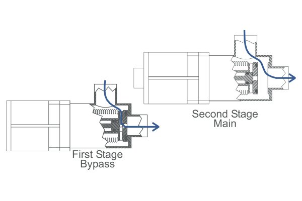 In the first stage, the bypass valve pumps down slowly from atmospheric pressure to a preset vacuum pressure. In the second stage, the main valve opens, allowing use of full pumping speed.