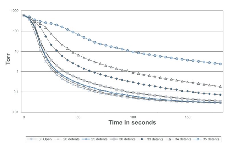 The bypass stage conductance is adjustable by turning an adjustment screw. The adjustment screw has machined detents that lock the screw into place during cycling. There are 10 detents per full turn. See Figure for the bypass pumpdown curve.