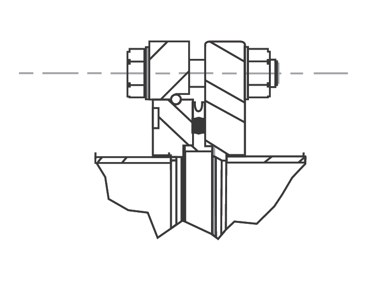 You can join an ISO-BF bolted flange to an ISO-MF an ISO-MF Multi-fastener flange by using a rotatable bolt ring on the ISO-MF flange. In attaching a rotatable bolt ring to an MF flange, the ring is first passed over the flange with the larger bore of the ring facing outward from the open port. The split retaining ring is then snapped into the groove on the periphery of the ISO-MF flange. Then the bolt ring is pulled forward into position. The vacuum flanges are then joined using nuts and bolts.