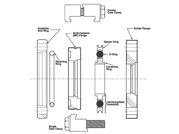 Series 76 flanges and components are made of type 304 stainless steel. Centering ring and seal assemblies are offered with an aluminum centering ring and spacer ring, or with a stainless centering ring and an aluminum spacer ring. Rotatable bolt rings and clamps are made of aluminum alloy. Retaining rings are made of steel. Flange seal surfaces are carefully machined and inspected for defects. They are cleaned and packaged to remain clean and protected in shipping. The Series 76 ISO-Universal flange components can be connected in various ways.