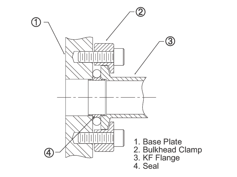 Bulkhead clamps are used to attach an ISO-KF flange directly to a chamber or base plate. The two-part, bolted clamp fits over the flange. A centering ring assembly is needed between the flange and the opening. The bulkhead clamp kit includes the two-piece clamp, bolts and washers.