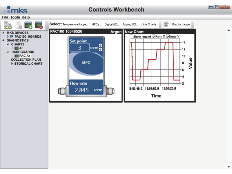 Controls Workbench software is an integrated, customizable software application that is included with the MKS Automation Platform. The CWB is a central, powerful interface that provides users a simple, complete solution for device configuration along with the ability to view, data log, chart and export process data, perform manual process control, process troubleshooting, and advanced tuning of the MKS controllers (PAC 100, Communications Module, MultiTherm 2000 and MultiTherm 1000).
