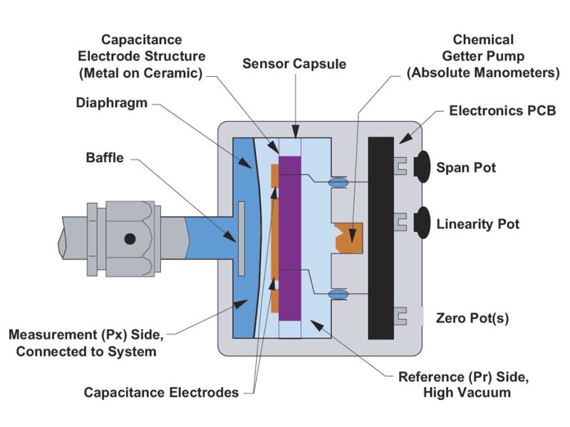 Capacitance manometers are electro-mechanical gauges that can measure both pressure and vacuum. The capacitance gauge translates a pressure-modulated movement in a thin diaphragm into an electrical signal proportional to the pressure. The pressure sensor is the thin diaphragm that is exposed to the pressure or vacuum being measured via the inlet tube. An electrode is mounted in the reference cavity behind the diaphragm. Pressure differences between the process and the reference cavity deflect the diaphragm slightly, changing the distance between it and the electrode. Variations in this distance produce variations in the capacitance between the diaphragm and the electrode creating an electrical signal that is proportional to the pressure change. Since differences in the capacitance signal are produced by physical changes within the manometer and not by changes in the gas properties, pressure measurements by the capacitance manometer are independent of the composition of the gas being measured.