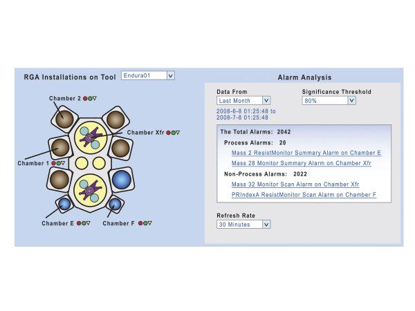 - Automatically lists alarm and warning events occurring on a particular tool and chamber over a specific period of time and provides a summary of the root cause. Includes drill down capability to view “raw” RGA and VID data