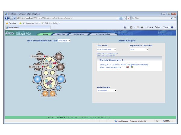 Using the TOOLweb RGA sensor integration option for process tools, the Vision 2000-C XD and Vision 2000-E XD can be used as a degas chamber sensor in a completely automated process environment (Figure 4). TOOLweb RGA maintains a constant monitoring of tool activities with all sensor data being framed by wafer logistics before alarm models are applied. Full alarm and data reporting to the FAB host and FDC are available allowing real-time monitoring of chamber conditions and flagging of any process excursions from ideal conditions.