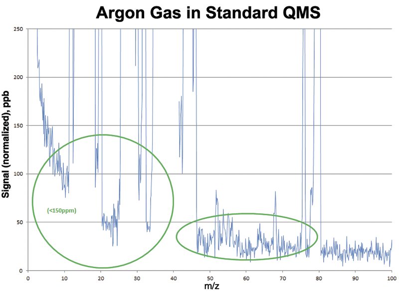 Degas processes typically employ inert gases such as Argon or Nitrogen. The use of these gases can be challenging as they generate an elevated baseline in RGAs due to large amounts of chemical background noise caused by metastable decay. This results in reduced sensitivity which can be problematic for manufacturers who want to identify changes in trace gases (which are indicative of issues during the manufacturing process) quickly and easily.