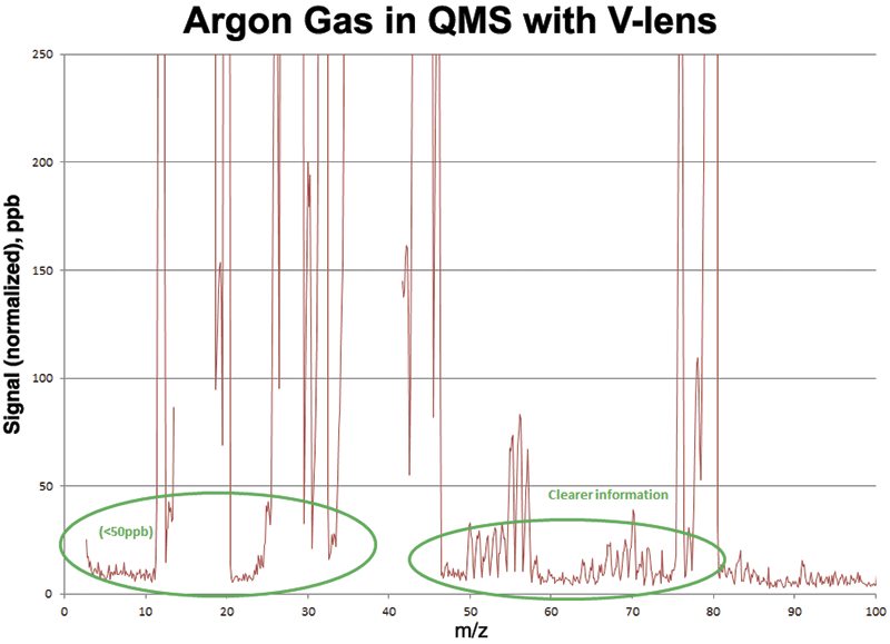 By maximizing the ratio between ALD, CVD, or Etch chamber gas signals and the gas background in the differentially pumped analyzer housing, the V-lens and closed ion source enables low ppm-level detection for trace contaminants in the process gas.