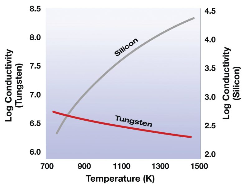 A further difference between the electrical characteristics of semiconductors and those of metals lies in the way their conductivities vary with temperature. At absolute zero (0 K), the electrical conductivity of a semiconductor has a value of zero (i.e., the conductivity is at its minimum) whereas a metal exhibits its maximum electrical conductivity at absolute zero; furthermore, conductivity increases with increasing temperature in a semiconductor, whereas it goes down with increasing temperature in a metal. Figure 2 shows a graph comparing the temperature variation of the electrical conductivity of a semiconductor (silicon) versus a metal (tungsten). The different behaviors of electrical conductivities seen in Figure 2 can be understood in terms of the different mechanisms that govern electrical conductivity in a metal versus a semiconductor.