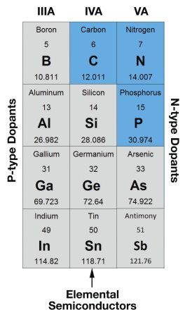 When compared with metals, semiconductor electrical conductivities are not very high, as can be seen from the values in Table 1. However, semiconductor conductivities can be significantly increased (and, in fact, fine-tuned to target values) by adding impurity atoms known as dopants. “Doped” semiconductor materials are commonly referred to as extrinsic semiconductors. Figure 4 shows the area of the Periodic Table that contains the elemental semiconductors and the dopant elements that can be used to create an extrinsic semiconductor. The dopants are those elements on either side of Column IVA in the Periodic Table. A dopant atom is similar in size to the intrinsic semiconductor atom in the same row but has either one fewer or one greater electron in its valence shell. The dopant atoms can easily replace the semiconductor atom in its crystal lattice. Figure 5 shows the insertion of either a Group VA (n-type dopant, phosphorus) or a Group IIIA (p-type dopant, boron) atom into the silicon crystal lattice as well as the effect that the substitution of the silicon atom by a dopant atom has on the band structure of the silicon.