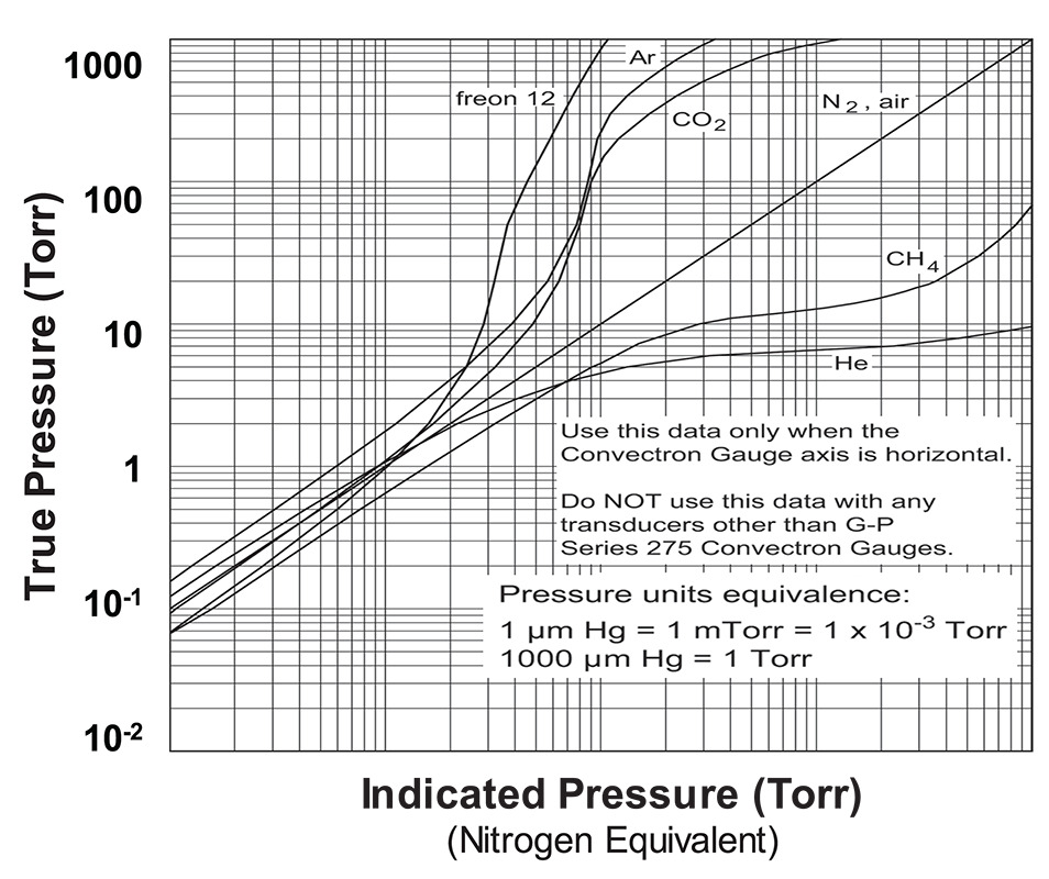 The Pirani gauge response to a change in pressure depends on the gas that is present in the system since every gas has a different specific heat capacity. It is also dependent on the molecular mass of the gas and on an accommodation coefficient that accounts for the residence time of the gas molecule in contact with the Pirani element. Users must therefore calibrate a Pirani gauge for the expected residual gas in the system. Figure 14 shows a graphical representation of the response curve (indicated pressure) of a nitrogen-calibrated Pirani gauge for different residual gases that illustrates the importance of proper calibration for a Pirani gauge.
