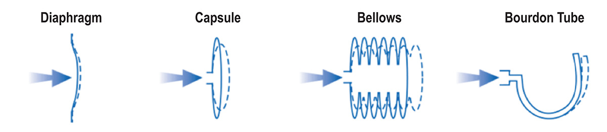 Figure 3 shows some of the structures that can be employed as deformation elements in a mechanical pressure measurement device. Mechanical deformation gauges include capacitance manometers, Bourdon gauges, resonant diaphragm gauges, bellows gauges, piezoelectric gauges, and others.