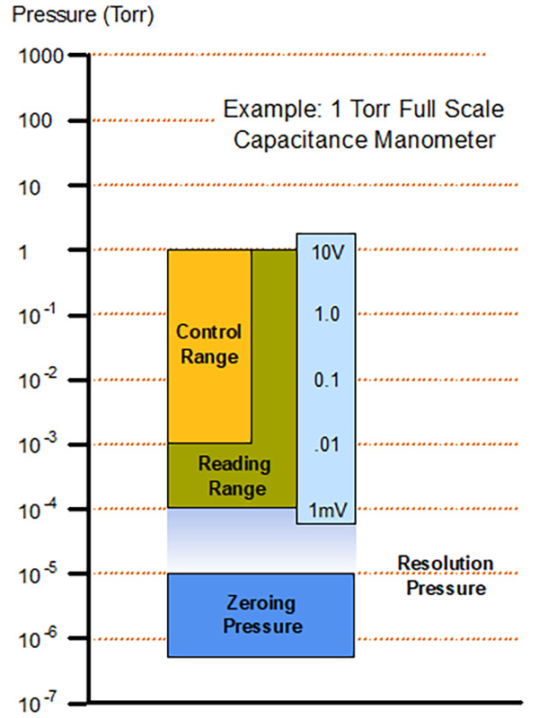 Figure 7 shows the wide variety of Baratron capacitance manometer configurations that are offered by MKS for different pressure and process environments. These manometers typically measure vacuum over four decades of range. They can be supplied in both heated and unheated versions. Heated versions are most accurate and reliable at >0.1% Full Scale while unheated versions give comparable performance at >0.5% Full Scale. All manometers, regardless of manufacturer, must be periodically zeroed to achieve the best accuracy and repeatability in their measurements. The best zeroing and device accuracy is achieved when the base pressure is <0.01% Full Scale. Baratron capacitance manometers that ranged below 100 mTorr Full Scale should be operated at >1% Full Scale when used in pressure control applications; since pressure control in the lowest decade of the range can be slow and less stable due to noise and A/D resolution limits of the gauge controller (Figure 8).